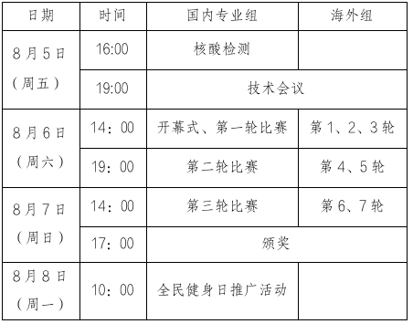 参赛人员、裁判员、工作人员等须按照《疫情防控工作方案》要求,做好健康申报、核酸检测等各环节工作, 做到安全参赛。