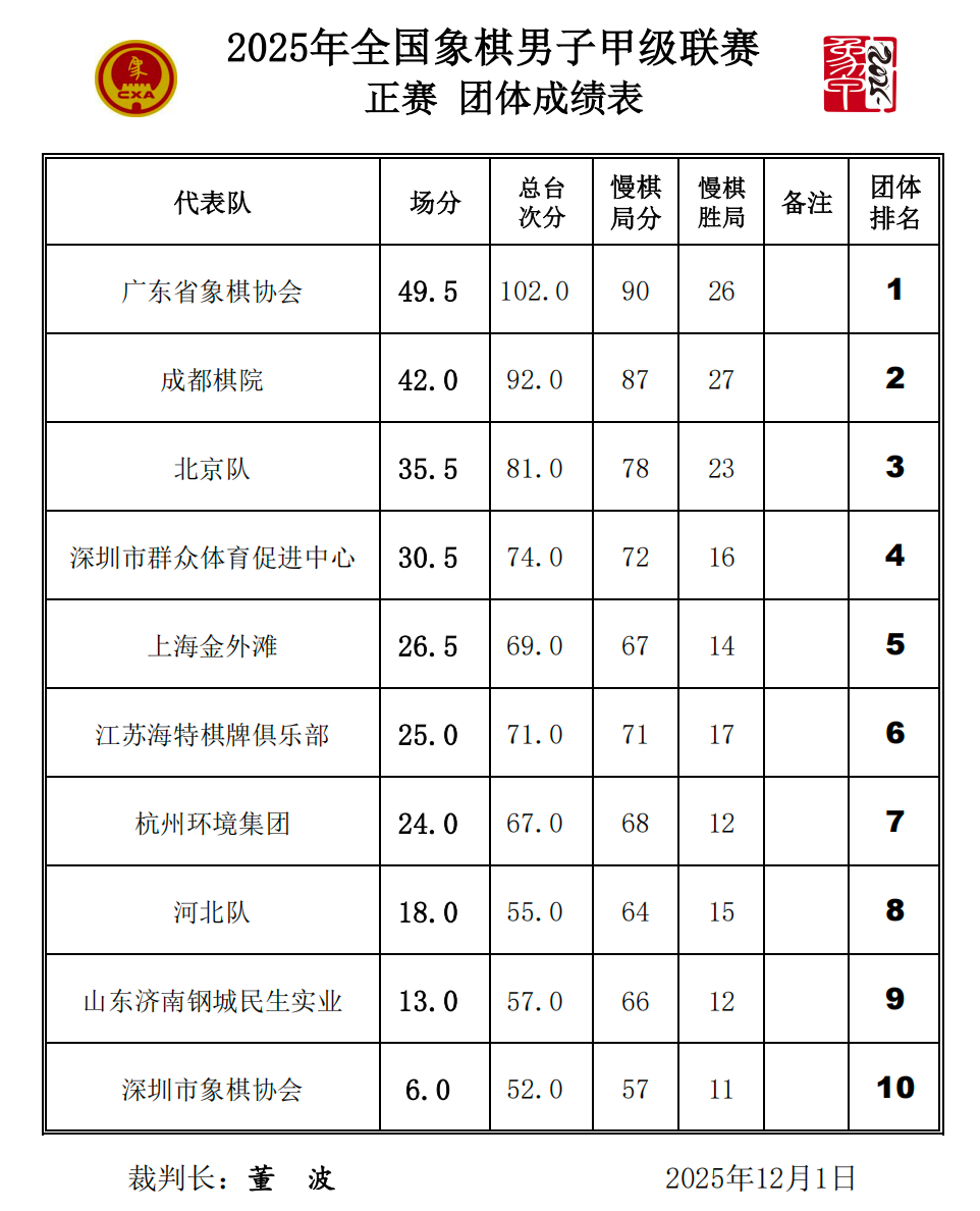 12月1日,2025年全国象棋男子甲级联赛在浙江省金华市进行第三阶段的争夺,最后广东省象棋协会队获得冠军,深圳市无剑象甲队获得第四名。